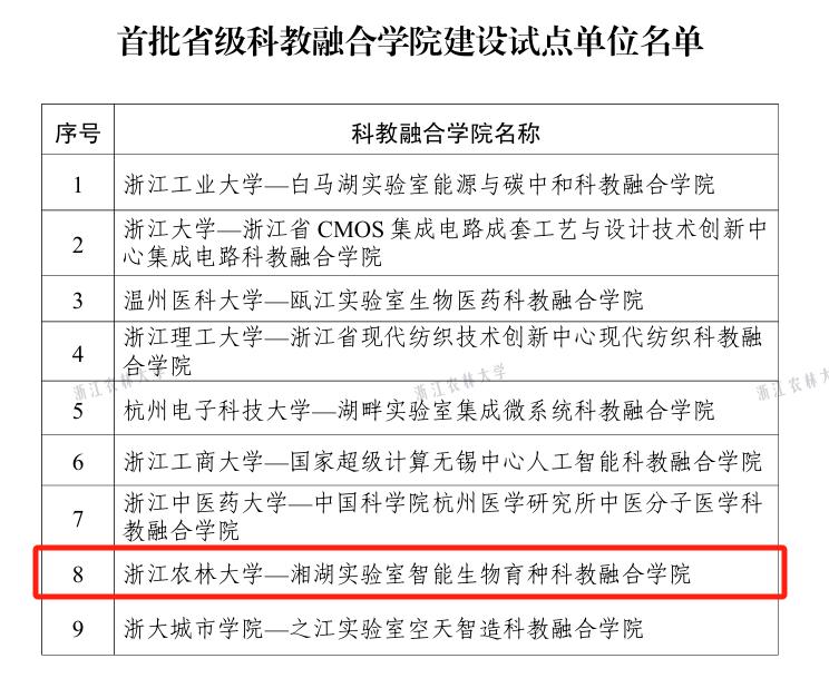 近日,浙江省教育厅办公室公布了首批省级科教融合学院建设试点单位名单。beat365平台唯一官网-湘湖实验室智能生物育种科教融合学院成功入选。