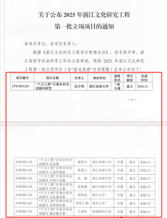 近日,浙江省哲学社会科学工作办公室公布了2025 年浙江文化研究工程第一批立项项目名单。由沈月琴教授主持的《“千万工程”引领乡村全面振兴研究》获重大项目立项,这也是学校获得的第二项省文化研究工程重大项目。