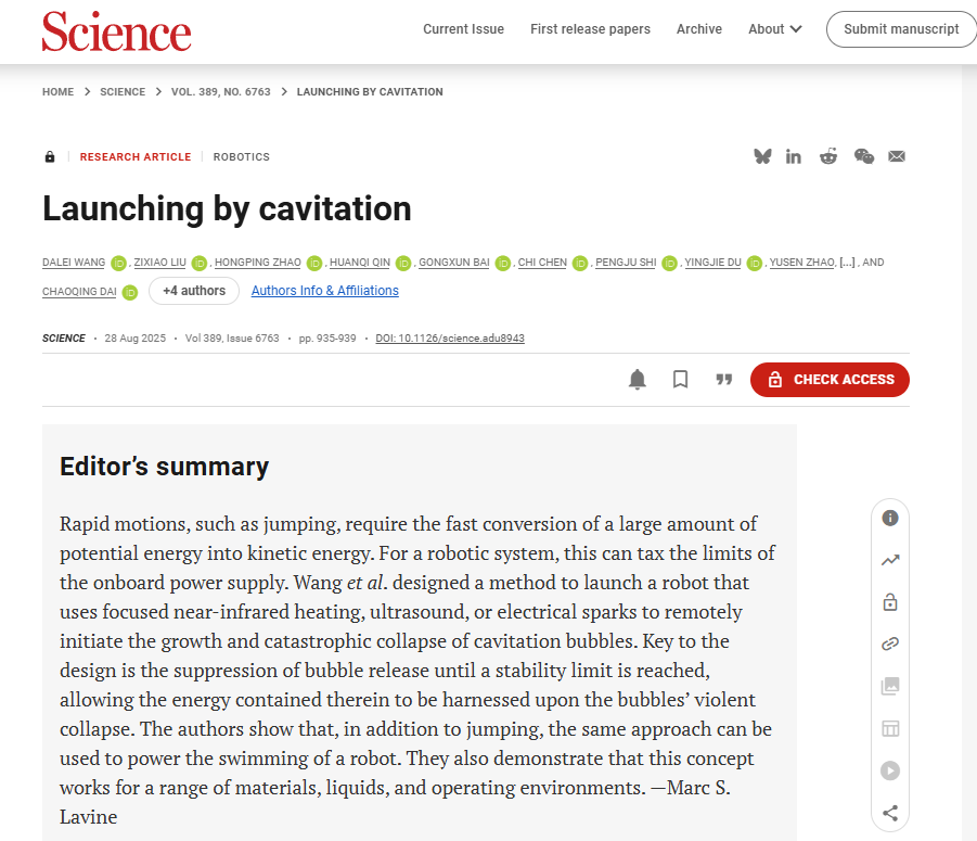 8月29日,全国重点实验室戴朝卿教授团队与加州大学洛杉矶分校贺曦敏教授团队合作,在国际顶级学术期刊Science上发表了题为Launching by Cavitation的研究论文。这也是beat365官网学者首次以第一完成单位和通讯作者单位在Science杂志上发表研究论文。