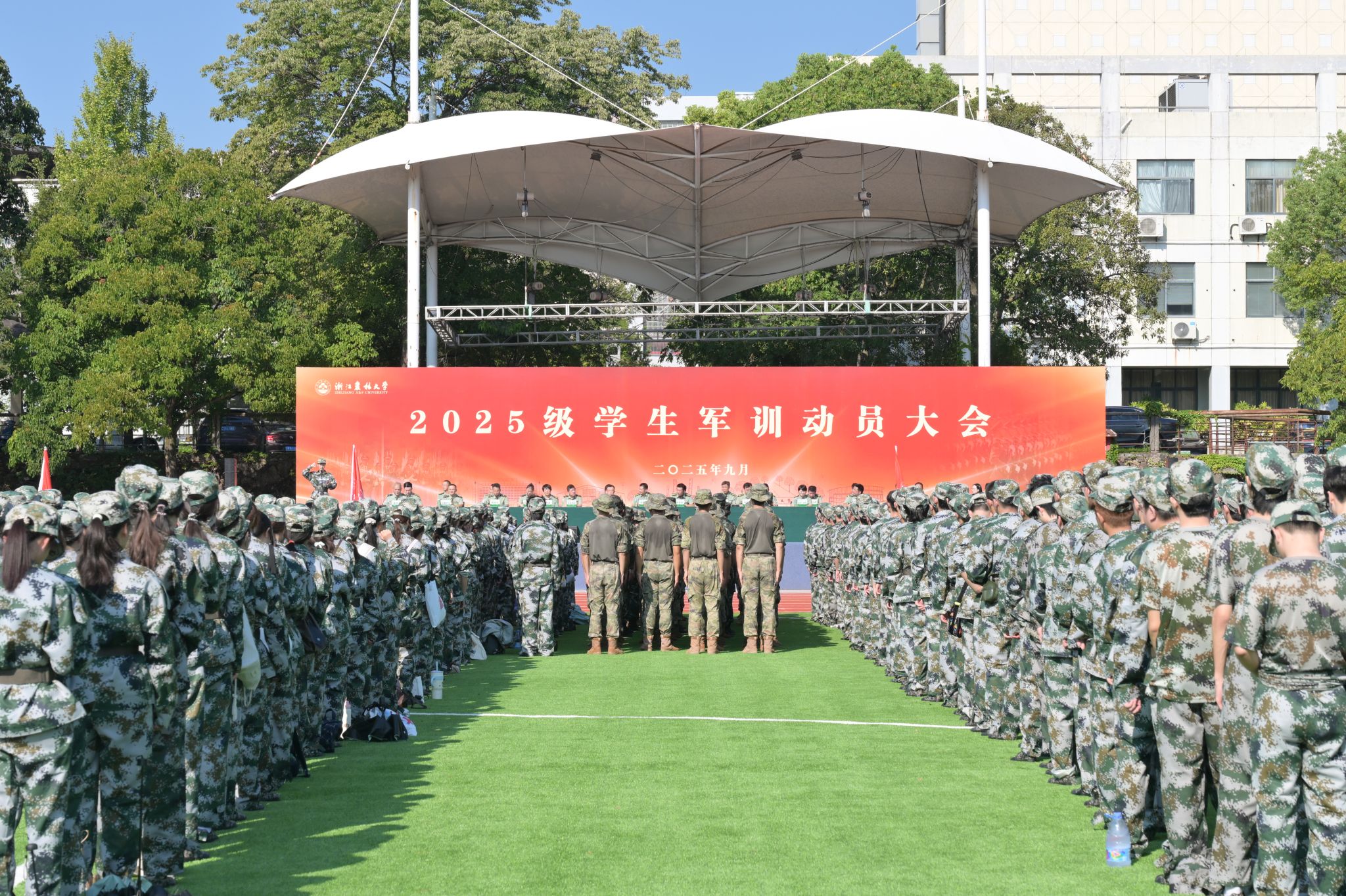 倪建均向2025级新生提出三点希望:一要厚植家国情怀,以“农”为志,传承红色基因,在中国人民抗日战争暨世界反法西斯战争胜利八十周年的特殊节点,体悟军人的忠诚信念,勇担强农兴农时代使命,将个人理想融入国家发展大局;二要锤炼意志品质,以“韧”为本,锻造奋斗精神,发扬“坚韧不拔、不断超越”的学校精神,在军训中锻造“肯干、能干、实干”的农林品质,以顽强意志战胜挑战、超越自我;三要加强组织纪律,以“规”为绳,筑牢团队根基,做到令行禁止、步调一致,将纪律意识内化于心、外化于行,为今后学习生活奠定坚实基础。他希望全体教官、教导员、指导员和参训学生牢固树立“安全第一”意识,科学组训、全力保障,确保军训安全有序、高质高效开展,圆满完成军训各项任务。