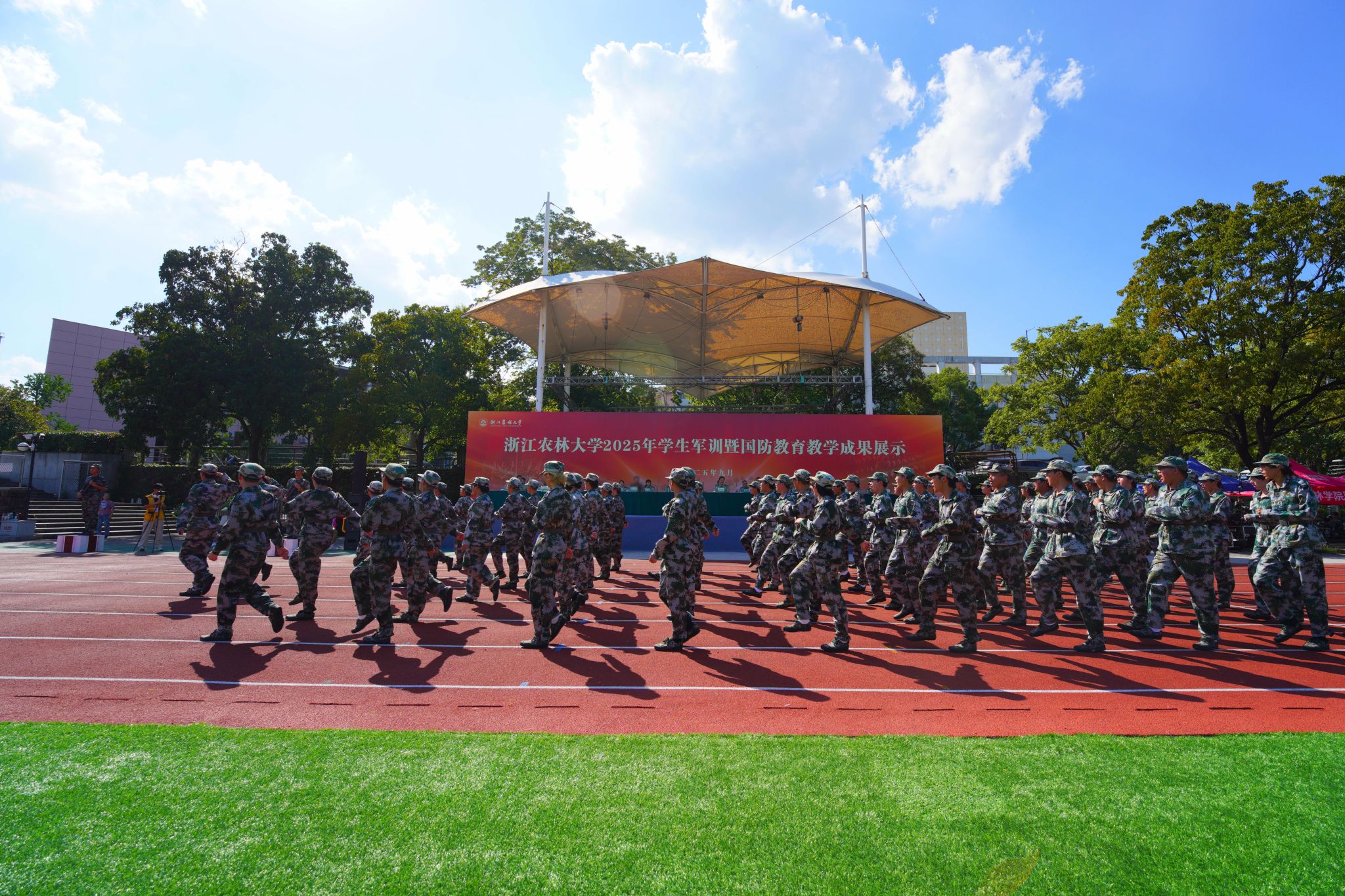 徐爱俊向全体承训官兵、学生教官以及参与军训工作的教导员、指导员和工作人员表示衷心感谢,并向顺利完成军训任务的全体新生表示热烈祝贺。他指出,军训是贯彻习近平强军思想、落实总体国家安全观、服务新时代人才强军战略的重要抓手。十天来,同学们经历了身体和意志的双重考验,充分展示了浙农林大“新青年”青春有为、奋发向上的精神风貌。他希望同学们将军训中培养的军人作风融入今后的学习生活中,坚定理想信念,厚植家国情怀,秉承“坚韧不拔、不断超越”的校训,努力成为“知农爱农、强农兴农”的新型人才。