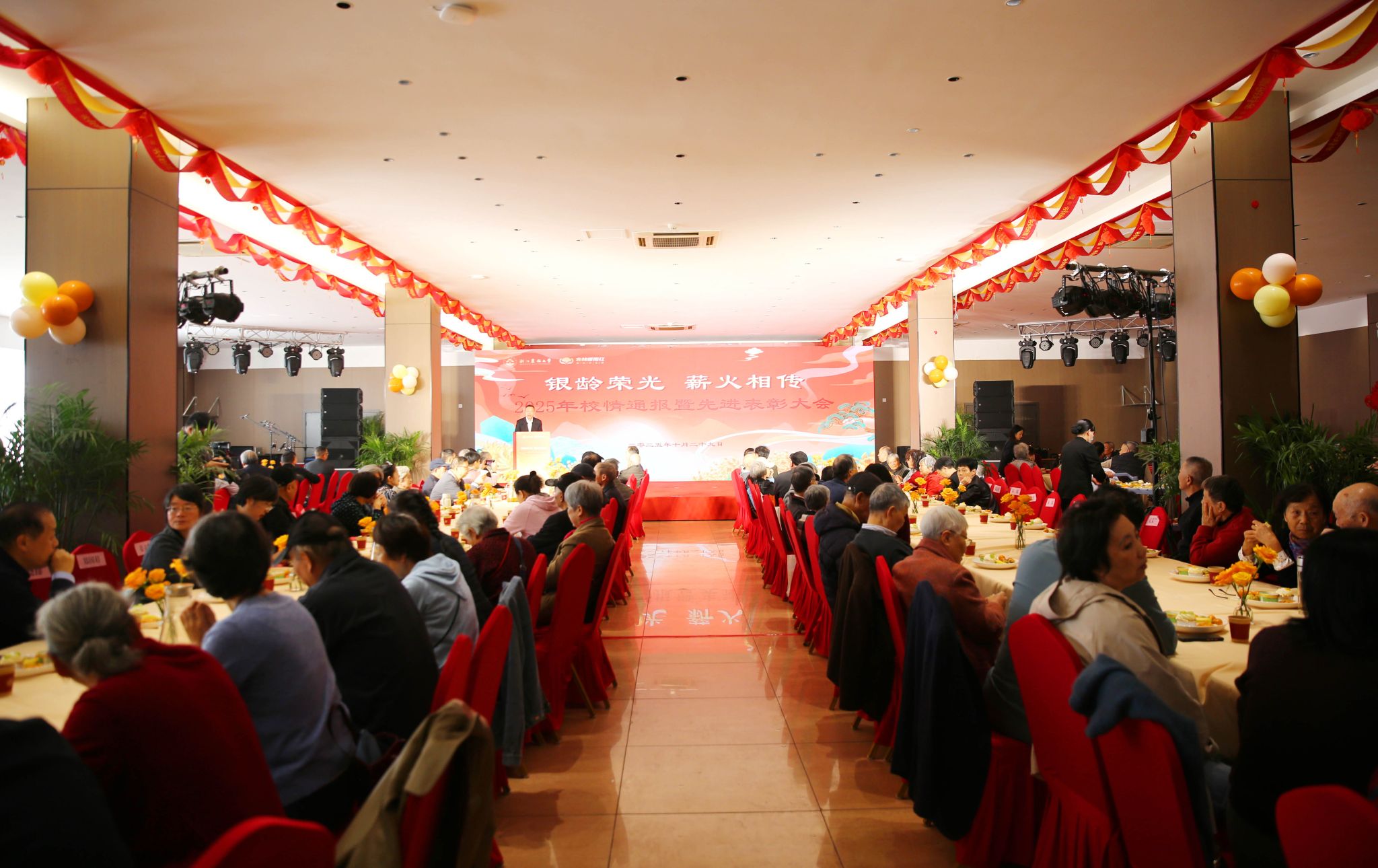 校长吴家胜、校党委副书记施美红,原代校长忻士文、原校党委副书记杨沛、原副校长王自勇、校党委原副书记冯尚申等出席活动。252位离退休教职工代表和相关部门负责人、二级党组织负责人参加。