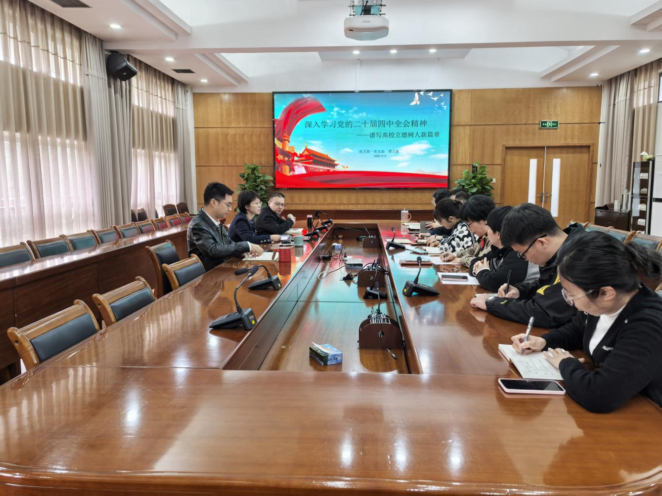机关第一党支部书记以“深入学习党的二十届四中全会精神,谱写高校立德树人新篇章”为题,面向支部全体党员讲党课,要求大家进一步聚焦主责主业,围绕高等教育、科技创新、人才培养等领域及学校重大举措,采取有力举措,在推动学校年度重点工作完成上走在前、做表率。