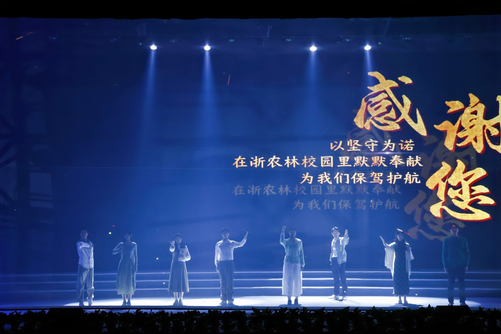 晚会随着纱幕慢慢开启,以舞蹈《衣锦溯源·启航》拉开序幕,一袭衣锦,承吴越文脉;一叶轻舟,启农林新程。在音乐剧《求真大道·奋进》中,同学们真挚动人地演绎,生动诠释了奋进的青春模样。《东湖寻梦·归来》以歌寄情,以舞载梦,带校友们重回东湖畔的青春岁月,踏上一场初心不改的归来之旅。情景朗诵《敬业征程·耕耘》让我们看到了浙农林大师者为党育人、为国育才的初心与坚守。合唱《家国情怀·荣光》让大家在熟悉的旋律中聆听那声穿越岁月的初心回响,感受那份历久弥坚的家国情怀。