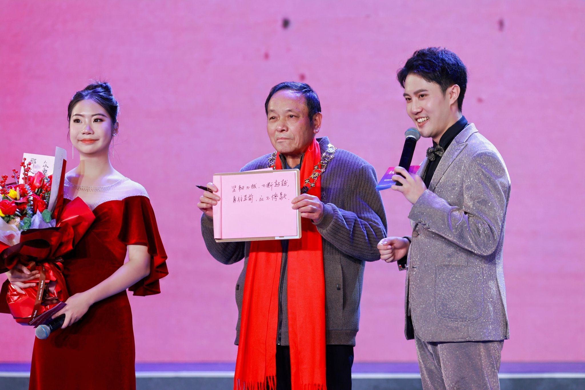 表彰大会上,学校最高荣誉“求真敬业奖”获得者、原党委书记陈敬佑登上舞台后,全场师生、校友纷纷起立,并致以热烈掌声。采访期间,无法言语表达的陈敬佑用笔写下自己的回答:“解放思想、更新观念”“确立目标、把准方向、走对路子”“坚韧不拔、不断超越”“勇往直前、永不停歇”。虽未发出言语之声,然每一字皆重如千钧;虽不能开口表述,可每一句都直抵人心。这几行文字,并非单纯的回答,而是坚定的誓言;并非终点的标志,而是精神的传承。