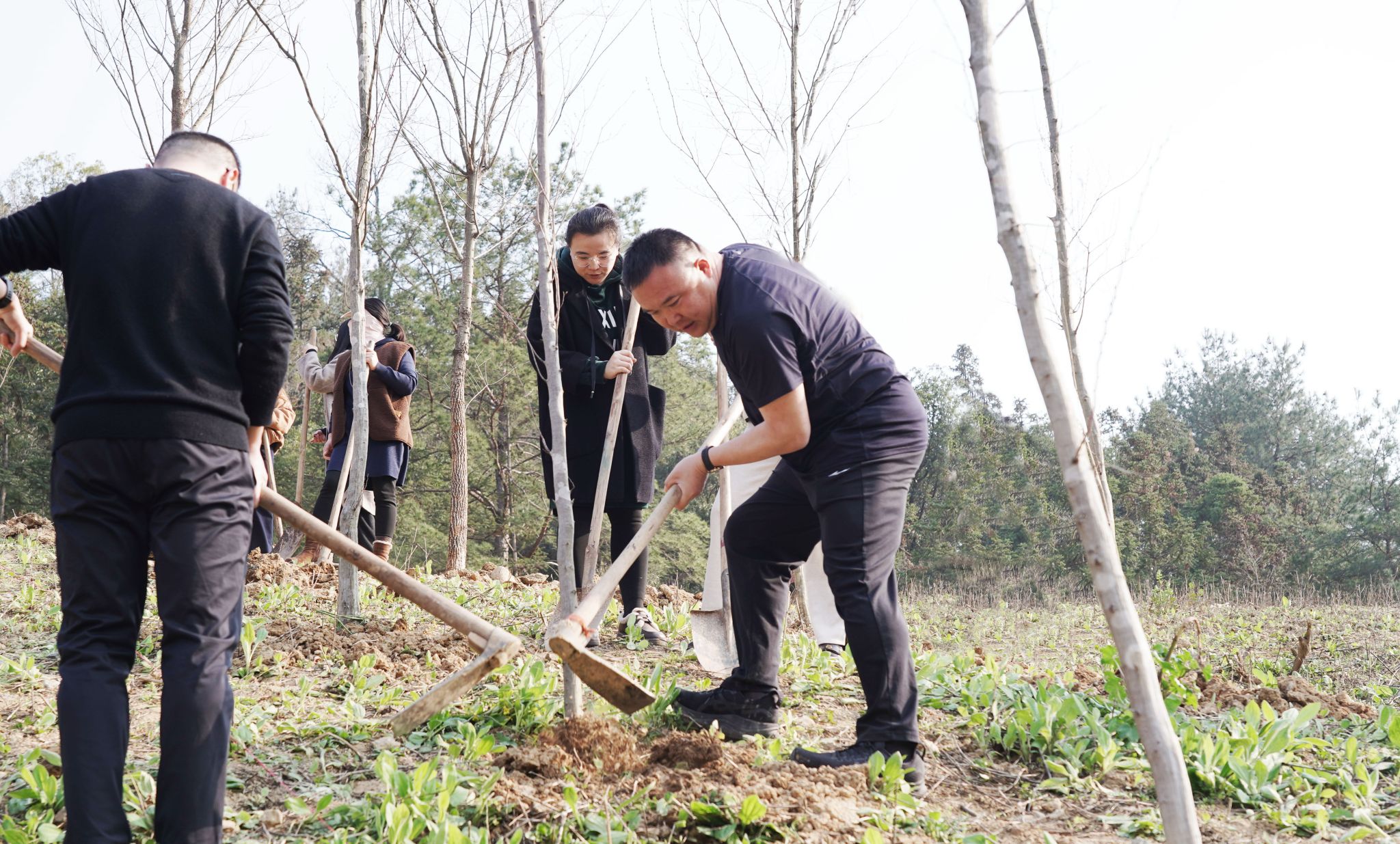 3月11日,东湖校区B区学生公寓东侧植树现场春意盎然、热火朝天。校党委书记朱斌、校长吴家胜等校领导带头参与,与机关教职员工、各学院师生代表一同挥锹培土、躬身劳作。大家手持锄头、铁锹等工具,分工明确、配合默契,按流程完成挖坑、扶苗、覆土等工序,栽下了一棵棵事先准备好的树苗。