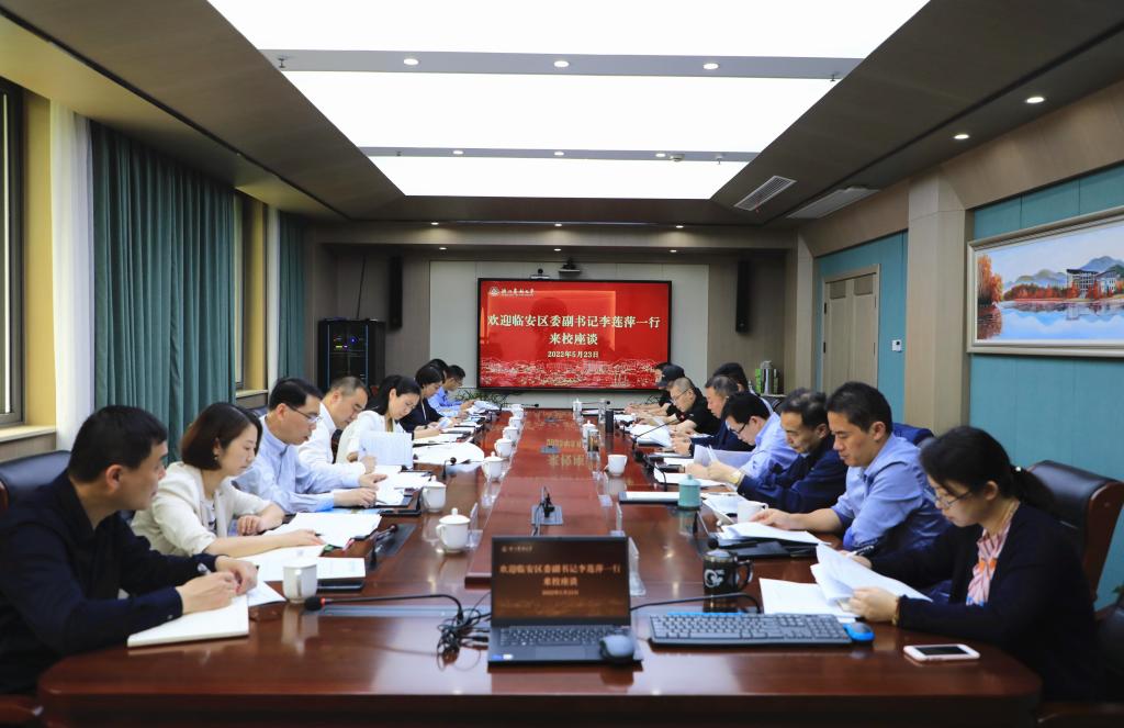 5月23日上午,临安区委副书记李莲萍、副区长罗爱芬率临安区发改局、农业农村局、科技局等相关部门来校交流区校合作项目事宜。校党委委员、副校长吴家胜,党委委员、组织部部长缪鲁加及学校有关职能部门负责人参加座谈交流。