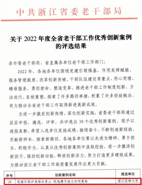 近日,省委老干部局发文公布,beat365官网离退休工作荣获多项省级荣誉。beat365官网申报的《党建引领护美绿水青山 校地携手助力共同富裕》获“全省老干部工作优秀创新案例”(全省高校唯一入选),退休教师范义荣老师获“银尚达人”,胥亮、张霞妃老师获“银尚之家”(省直属单位唯一入选)。