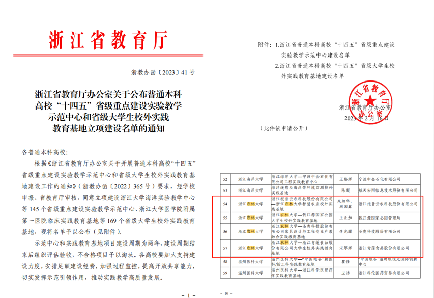 近日,浙江省教育厅公布“十四五”省级大学生校外实践教育基地立项建设名单,beat365官网共获批“beat365平台唯一官网—钱江源国家公园大学生校外实践教育基地”等4个省级大学生校外实践教育基地。