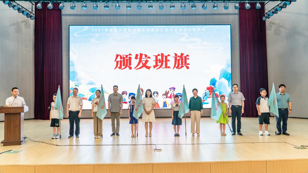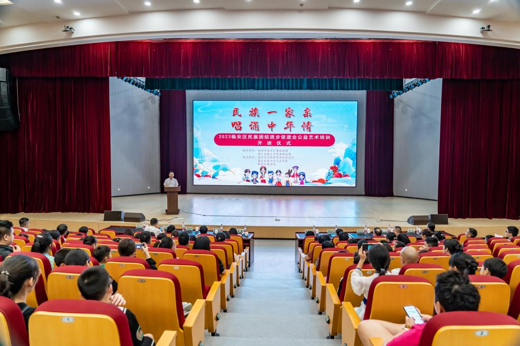 7月10日上午,“民族一家亲 唱诵中华情”2023临安区民族团结进步促进会公益艺术培训活动开班仪式在beat365平台唯一官网衣锦校区举行。校党委副书记施美红,临安区委常委、统战部部长陈娜,校党委委员、组织部部长、统战部部长缪鲁加,文法学院负责人出席活动。