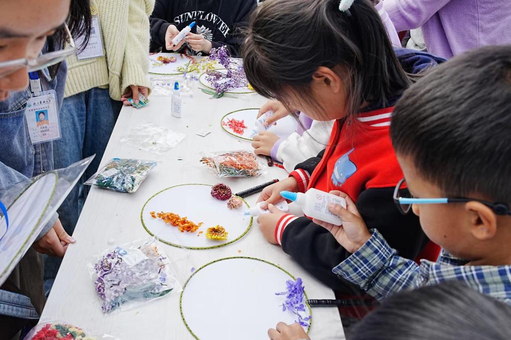 菊花展中还举办了各种才艺表演,同学们参与了一系列主题活动,包括“保护环境、从我做起”生态环保知识问答,“定格生态”压花团扇制作,“记录美好事物,留下秋日时刻”叶脉书签,“融合生态,微观自然”微景观生态瓶+流浪瓶制作,“与枯叶对话,与自然交心”枯花叶拼贴绘画,“花香四溢,闻香识花”嗅觉探花等,现场一片热闹的景象。