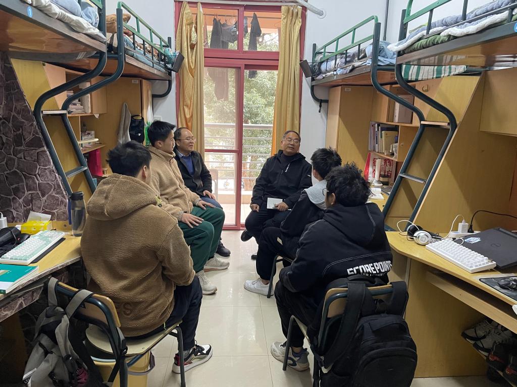在学生寝室,胡祖吉与园艺学院、农学院的同学进行了交流。他一一询问在场同学的学业与职业规划、课程学习、文体活动、亲子关系、社会实践等方面情况。他希望,各位同学要积极向上,乐群向善,争做身心健康、奋发有为的农林学子;要不负青春,认真学习,不断提高扎根基层、服务“三农”、服务社会的本领;要提升抱负,锤炼品格,不断增强对社会、家庭、母校的责任担当意识。
