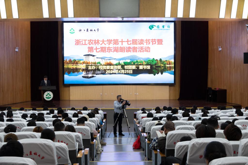 春光作伴好读书,书香氤氲浙农林。4月25日下午,学校第十七届读书节暨第七期东湖朗读者开幕式在图书馆第一报告厅举行。校党委副书记施美红出席并致辞,主办单位负责人和各学院师生代表近五百人参加。