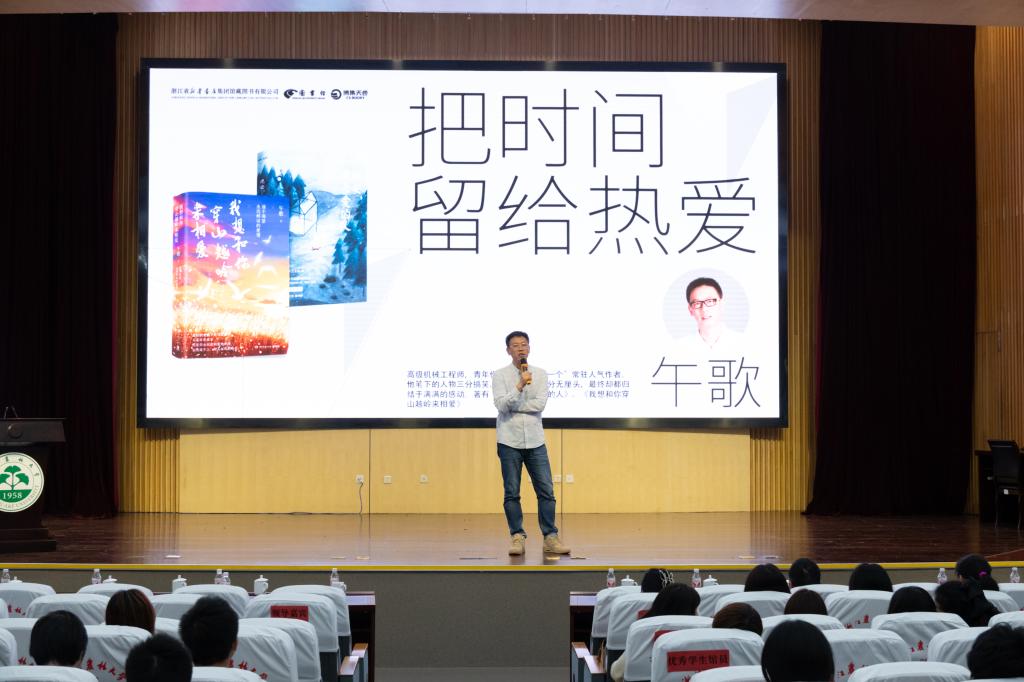 随后,青年作家午歌作客书香农林之悦读会,为师生带来一场“把时间留给热爱‘从机械工程师到畅销书作家’”的分享会,分享了他独特别样的人生经历、创作历程和对阅读的感悟。他真诚热情的态度、风趣幽默的语言深深吸引着在场师生,其作品文字背后蕴含的是温暖、执着和坚定的力量,给人以满满的正能量。