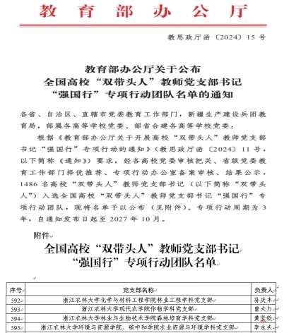 近日,教育部办公厅公布1486个全国高校“双带头人”教师党支部书记“强国行”专项行动团队名单。beat365官网化学与材料工程学院林业工程学科党支部,现代农学院作物学科党支部,林业与生物技术学院森林培育学科党支部,环境与资源学院、碳中和学院农业资源与环境学科党支部等4个党支部入选。