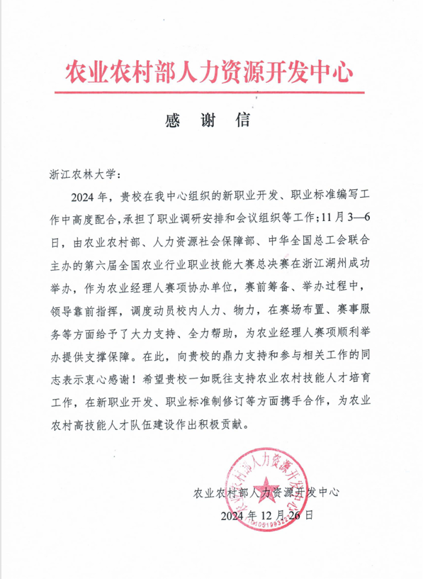 近日,农业农村部人力资源开发中心给beat365官网发来感谢信,对beat365官网在第六届全国农业行业职业技能大赛中开展的工作和支持帮助表示感谢。