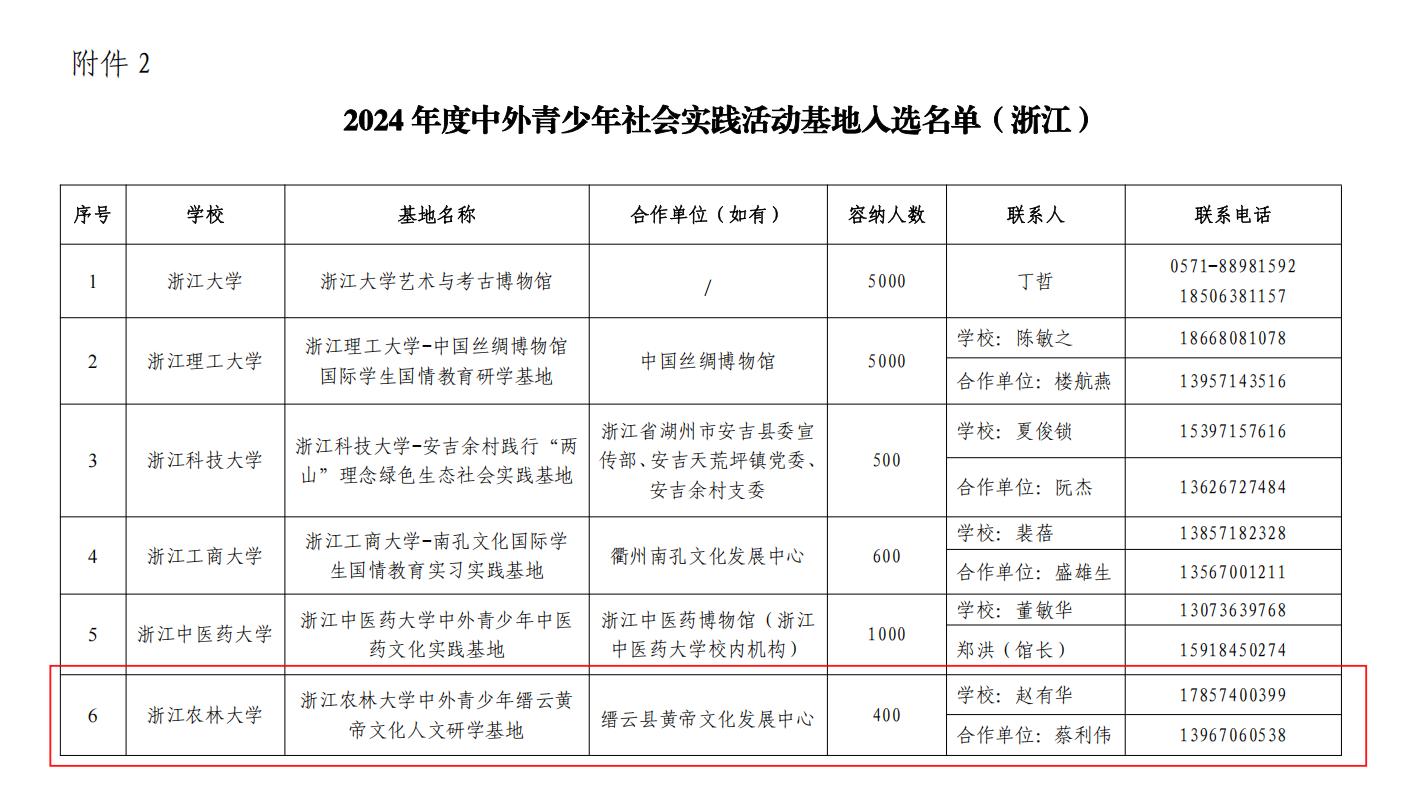 近日,浙江省高等学校国际学生教学指导委员会下发《关于公布2024年度来华留学中国国情教育优秀课程和中外青少年社会实践活动基地入选名单(浙江)的通知》,由教育部国际合作与交流司委托、中国教育国际交流协会组织的全国首批来华留学生中国国情教育优秀课程和中外青少年社会实践活动基地征集工作结果揭晓。beat365官网与缙云县黄帝文化发展中心合作申报的“beat365平台唯一官网中外青少年缙云黄帝文化人文研学基地”入选,成为全国首批115个中外青少年社会实践活动基地之一,标志着beat365官网国际学生国情教育的校地合作迈出了重要一步。