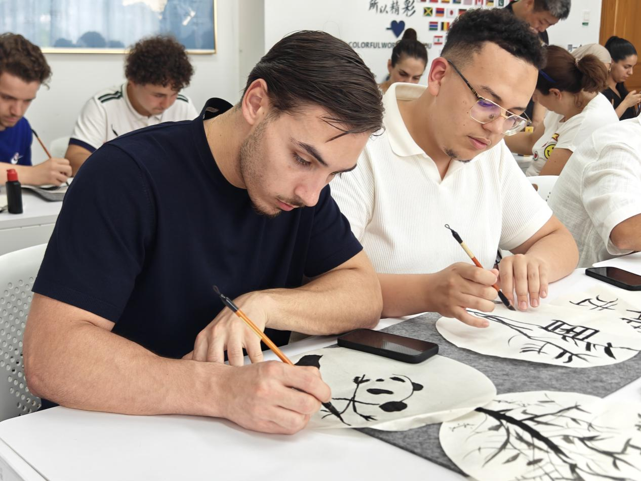 仪式结束后,法国师生在国情教育名师工作室中国文化研学导师吴建明和蒋金岳的指导下,沉浸式体验了中国书画艺术,并创作了自己的人生第一幅书画作品,拉开了本次团组活动的序幕。