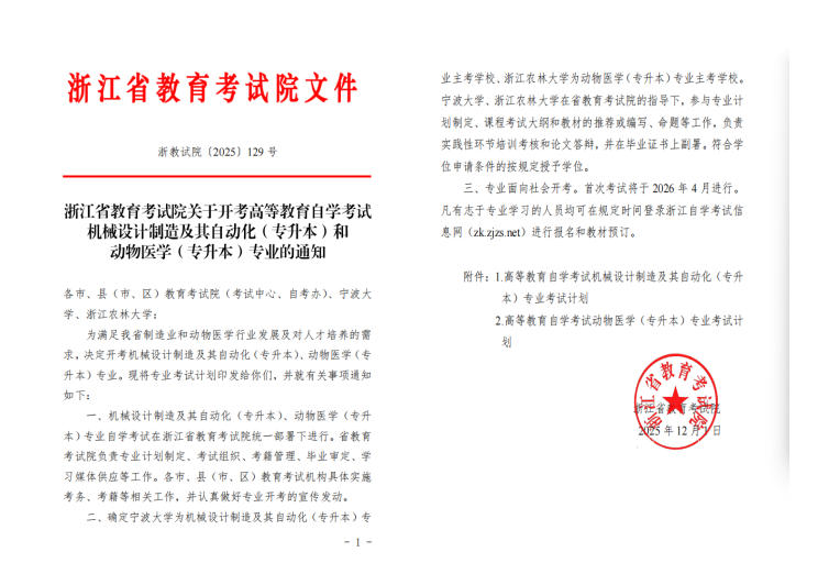 近日,浙江省教育考试院发布2025年高等教育自学考试新专业开考通知,决定在我省新增“机械设计制造及其自动化(专升本)”和“动物医学(专升本)”两个自考本科层次专业,并明确beat365平台唯一官网为“动物医学(专升本)”专业主考学校。这是beat365官网在涉农学科领域主考专业布局的进一步拓展,标志着学校服务社会、深化继续教育体系建设迈出重要一步。