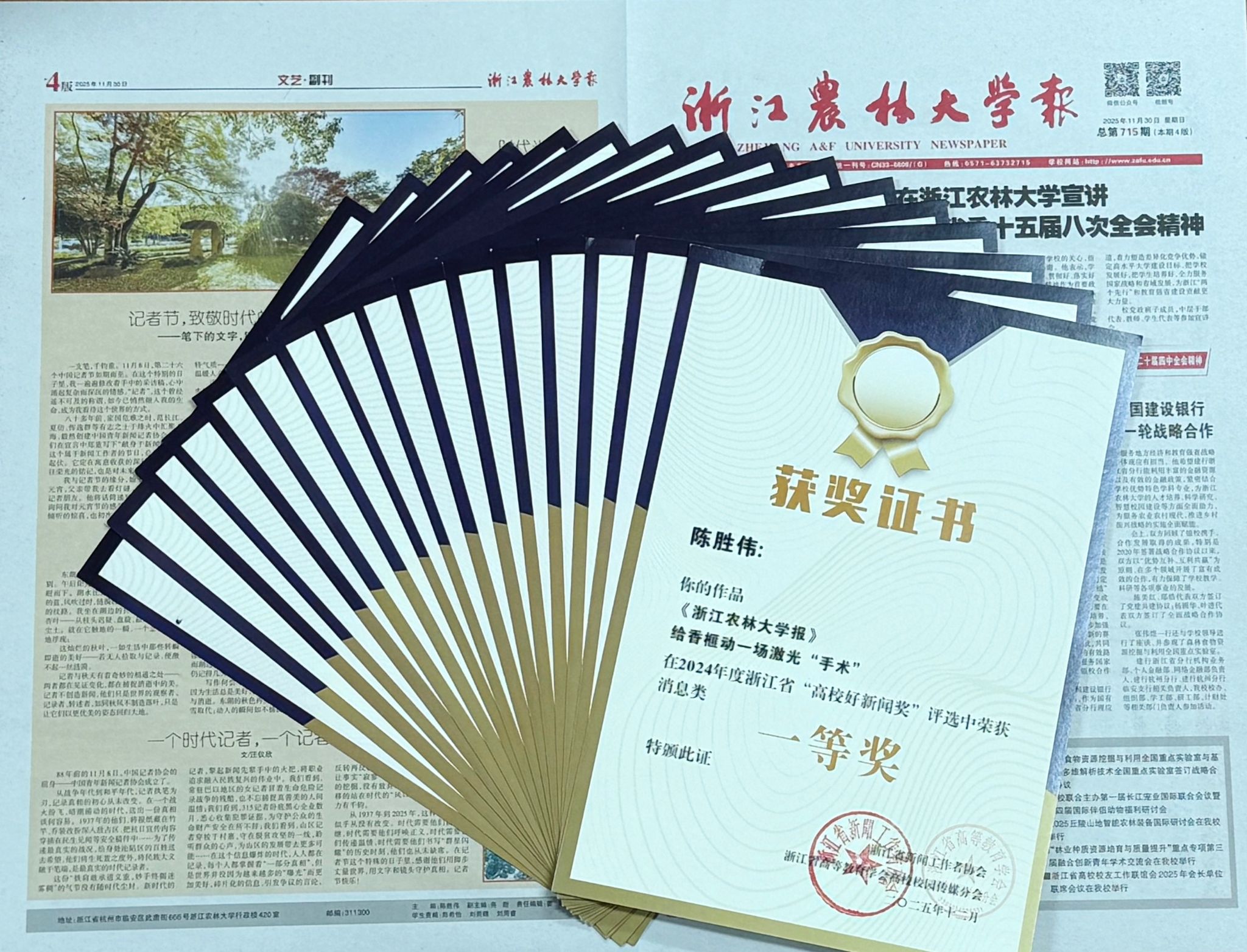 2024年度,beat365官网共有四件新闻作品获奖。其中《给香榧动一场激光“手术”》获消息类一等奖,《陈每文:倾力捐资彰显大爱,助学育人感动校园》获通讯类一等奖;《beat365平台唯一官网报》2024年2月29日第700期第02.03版获版面类一等奖;《以“功成必定有我”的担当作为奋力推进高水平大学建设》获评论类三等奖。