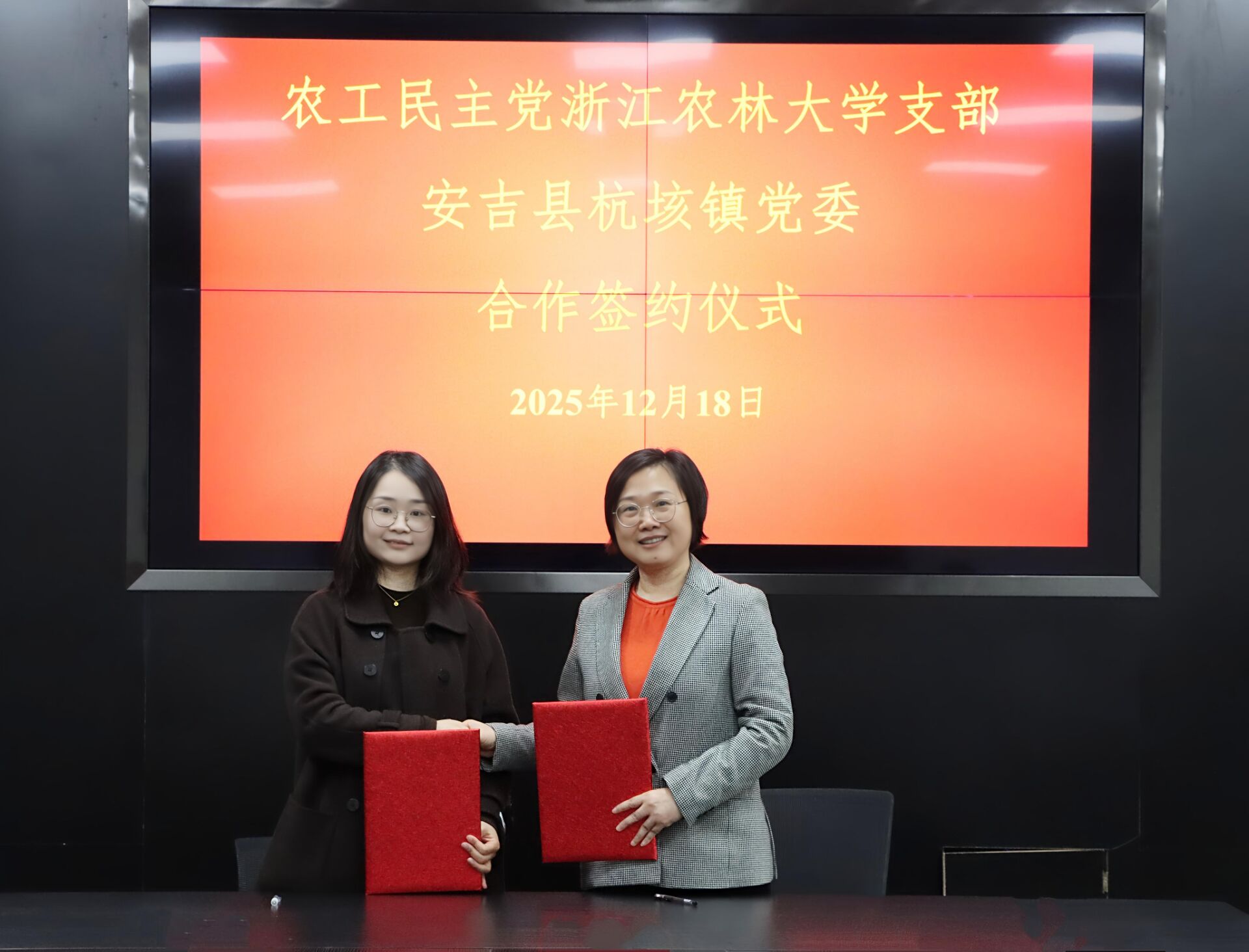 12月18日,农工党beat365平台唯一官网支部与安吉县杭垓镇党委合作签约仪式在杭垓镇举行。校党委副书记、统战部部长倪建均,校党委宣传部部长、统战部常务副部长晋杜娟,统战部相关工作人员、农工党学校支部部分党员、杭垓镇相关负责人和部分村负责人参加活动。农工党学校支部主委应叶青与杭垓镇党委负责人签订合作协议。