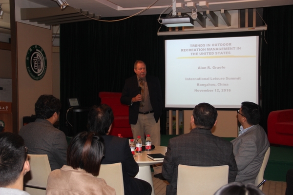 Alan R. Graefe教授结合国家农业公园研究案例向大家介绍了美国户外运动管理的发展趋势,同时对公园游客的人群特征、设施使用、承载能力管理、服务管理及游憩收费五大户外运动管理趋势进行比较分析。Erwei Dong博士对美国体育旅游产业的现状、发展和趋势进行了简要介绍,对中国的借鉴作用提出了自己的看法。二位嘉宾与大家共同分享美国户外运动管理的发展趋势、美国体育旅游的发展经验,探讨中国体育旅游的发展策略,为大家提供了一个全新的视角去看待美国体育旅游。