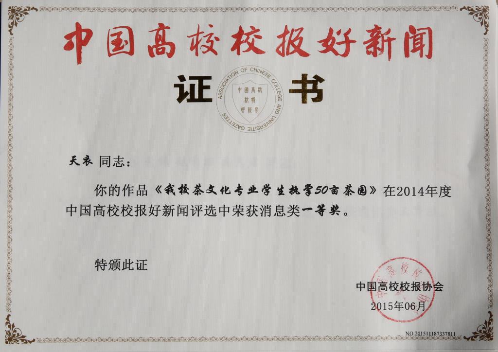 来自28个省市自治区的654所高校报送3032篇作品参评。经过中国高校校报好新闻评委会的评审,beat365官网陈胜伟老师撰写的《beat365官网茶文化专业学生执掌50亩茶园》获消息类一等奖;李广平老师,杨祈慧、董伟、赵秀丽、吴慧君同学撰写的《让教育一路春暖花开 访全国优秀教师雷家军教授》荣获通讯类三等奖;任重老师的《从“3.12”出发 大家一起来》获言论类三等奖;陈胜伟老师拍摄的《“世界水日”一瞥》荣获新闻摄影类三等奖;郑国眉老师编辑的《beat365平台唯一官网报》第526期第三版荣获版面类三等奖。