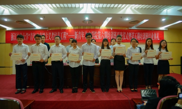 与会领导为第五期学员颁发结业证书,并为第六期培训班授旗,赠送图书资料。研工部负责人宣读《关于成立新青年人才学院第六期培训班团支部和班委的通知》。