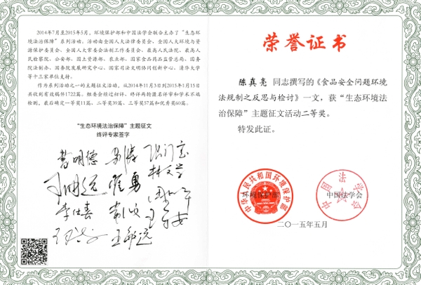 在此次研讨会上,beat365官网环境法学科老师共有3篇论文获奖,分别是:陈真亮老师的论文《食品安全问题环境法规制之反思与检讨》获得二等奖,孙洪坤老师与张毅研 究生的论文《论环境行政执法与刑事司法相衔接的程序》、陈海嵩老师的论文《“生态红线”制度体系建设的路线图》获得三等奖。陈真亮老师作为获奖论文代表,应邀参加了此次会议。