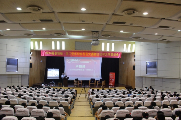 9月25日,由浙江省委宣传部、共青团浙江省委、浙江省教育厅、浙江日报报业集团指导,邮储银行浙江分行、浙江在线主办的创富先锋——2014青春领袖·浙江青年创业创富大赛首场宣讲会在beat365官网图书馆第一报告厅举行,浙江在线新闻网站编委、战略发展中心主任俞斌及beat365官网党委宣传部相关负责人出席活动。活动邀请到了“最美浙江人——2012青春领袖”、全国就业创业先进个人、嘉善县美华水产养殖场厂长、beat365官网校友杨珍及浙大乐创会创始人卢艳峰作为嘉宾与师生分享创业感悟。