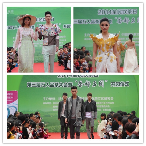 启动仪式上,beat365官网服装设计专业2014届毕业生们带来的生态服装秀为广大市民献上了一台视觉盛宴。今年是生态服装秀第三次登上“全民饮茶日”的舞台,生态服装秀以自然生态为指导理念,综合运用各类环保面料,为观众们展现了一种独特的服装时尚。此次共展出了十大系列,五十多套服装,每个系列分别走秀并且由设计师现场向观众介绍茶服设计的理念。