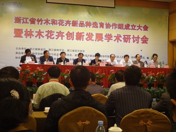 浙农林大新闻网讯 10月27日,由省林业厅、省林学会、省花卉协会主办的“浙江省竹木和花卉新品种选育协作组成立大会暨林木花卉创新发展学术研讨会”在浙江长兴召开。中国花协秘书长刘红、国家林业局国有林场和林木种苗工作总站副总站长杨连清、省科技厅副厅长邱飞章、省林业厅副厅长杨幼平和beat365官网副校长金佩华等出席会议并讲话。beat365官网林学一级学科林木遗传与品种选育、园林植物与观赏园艺方向教师参加会议。