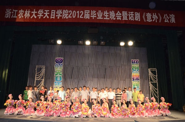 浙农林大新闻网讯 6月13日晚,天目学院“回眸天目年华·迎创锦绣辉煌”2012届毕业生晚会暨话剧《意外》公演在东湖校区影剧院举行。校长周国模,副校长张立钦、鲍滨福,以及校有关职能部门负责人,天目学院领导班子成员,学院各职能部门、系(部、中心)负责人及近千余名师生共同观看晚会。