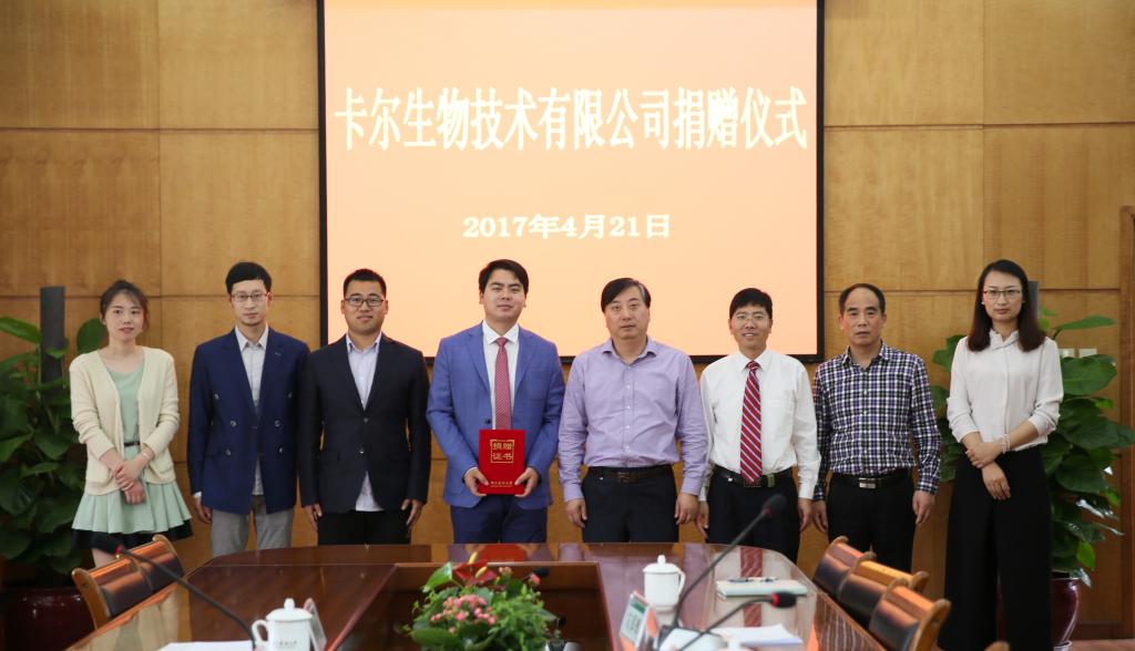 4月21日,临安卡尔生物技术有限公司捐赠仪式举行。副校长金佩华、临安卡尔生物技术有限公司董事长林高昂、校友办主任余剑耀、动物科技学院院长宋厚辉、党总支书记仲晓婷出席仪式,卡尔公司相关负责人和动科院师生代表参加仪式。