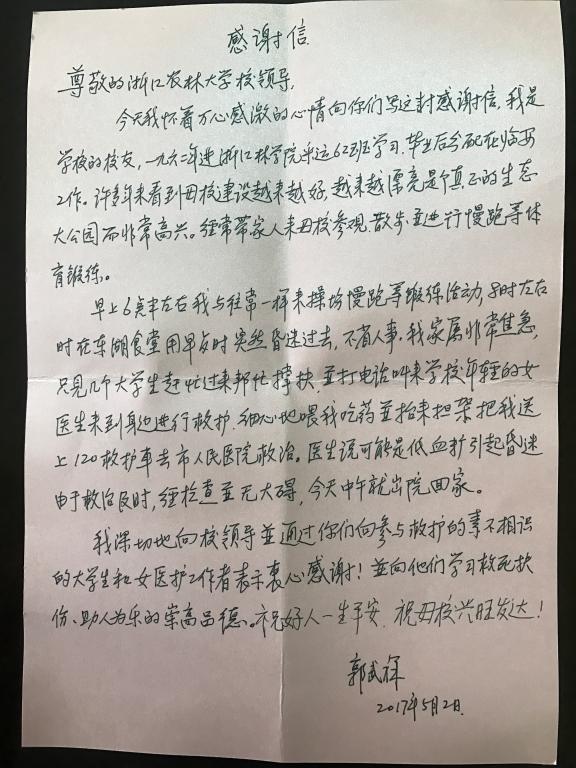 在信中,郭武祥先生写道,“我向参与救护的素不相识的大学生和女医护工作者表示衷心感谢!并向他们学习救死扶伤、乐于助人的高尚品德。祝好人一生平安,祝母校兴旺发达!”