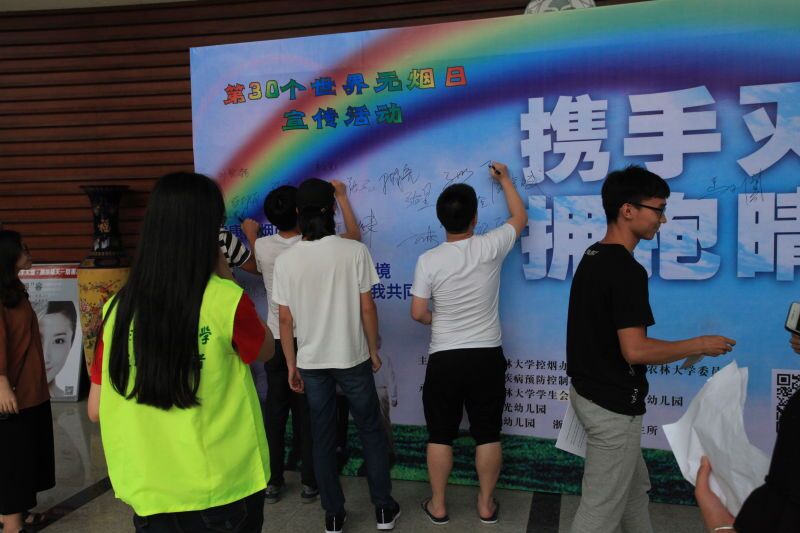 由学校控烟办、校团委主办,临安市疾控中心、校卫生所协办,共同发起“2017年世界无烟日”宣传活动。活动期间,学生代表宣读了《无烟生活•健康成长》倡议书,并在“控烟倡议签名墙”上签名承诺。