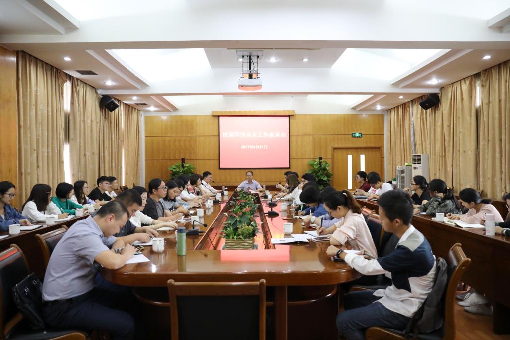 9月21日上午,校园网络安全工作座谈会在行政楼第一会议室举行。校党委委员、宣传部部长胡祖吉参加会议并讲话。杭州市临安区公安局网络警察,宣传部、信息教育中心负责人以及30余位相关网站、新媒体负责人和管理员参加了座谈。