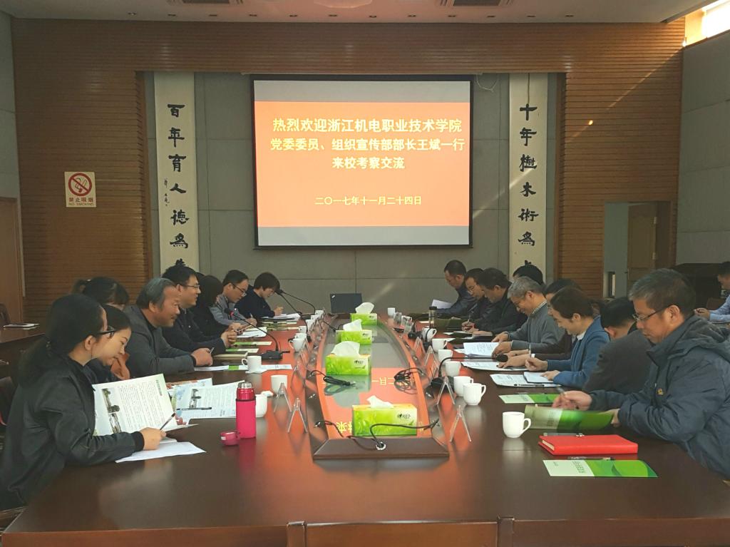 11月24日,浙江机电职业技术学院党委委员、组织宣传部长王斌一行来校考察交流。校党委委员、组织部长童晓晖出席,部分二级党组织书记、副书记,党支部书记代表参加交流。