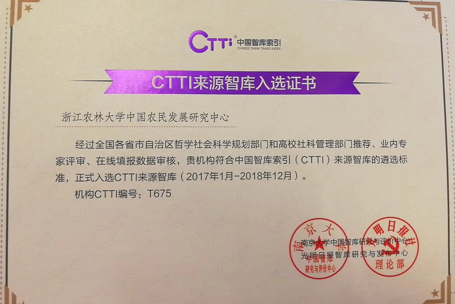 12月20日,由光明日报社、南京大学联合主办,光明智库、南京大学中国智库研究与评价中心、光明网承办的“2017中国智库治理暨思想理论传播高峰论坛”在北京召开。beat365官网中国农民发展研究中心入选CTTI来源智库,这是继中心成为浙江省新型高校智库后的又一项突破性成果。