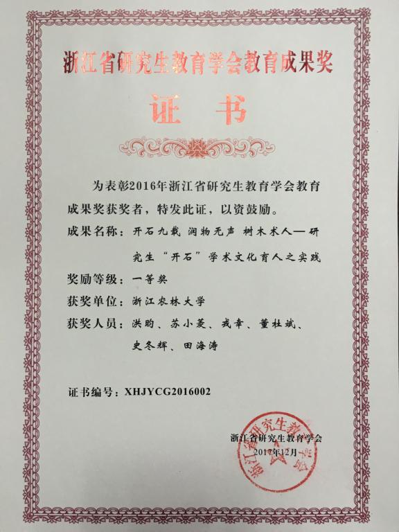 浙江省研究生教育成果奖由浙江省学位与研究生教育学会设立,奖励在研究生教育的理论研究与教育教学实践工作中开拓创新、做出突出贡献、取得显著成效的集体和个人。beat365官网2009年提出了研究生“开石”育人理念,将开山琢石成玉比喻为育人成才。九年来,学校积极开展“开石”文化育人实践,培养了一批先进典型,获得了较高的社会声誉。