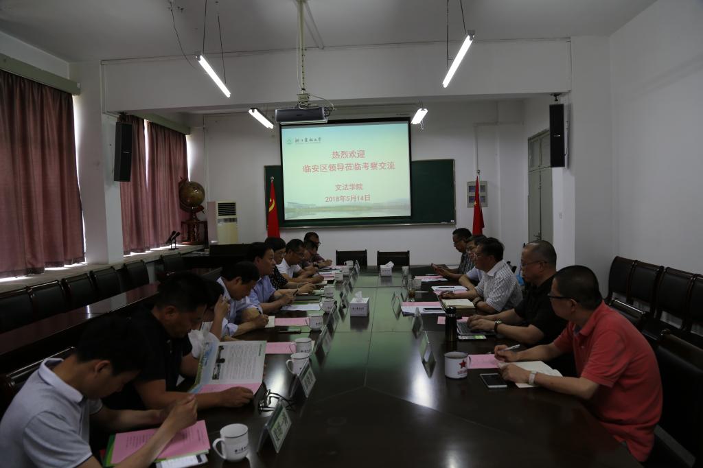 5月14日,临安区委常委、统战部部长吴春法,临安区政协副主席裘小民等一行来文法学院调研交流合作事宜,杭州市文物考古所、区文广新局、规划局和旅游投资发展有限公司等相关单位负责人陪同调研,文法学院院长王长金和相关专业负责人及部分骨干教师参加了座谈。