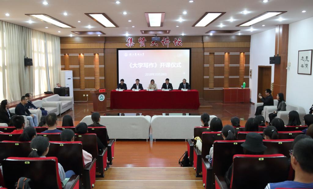 10月28日,《大学写作》课程开课仪式在集贤大讲坛举行。副校长沈月琴,宣传部、文法学院、集贤学院等相关负责人以及《大学写作》教学团队部分成员参加仪式。仪式由教务处处长郭建忠主持。