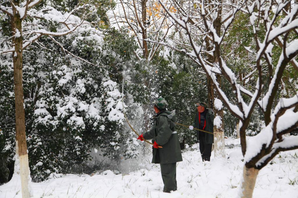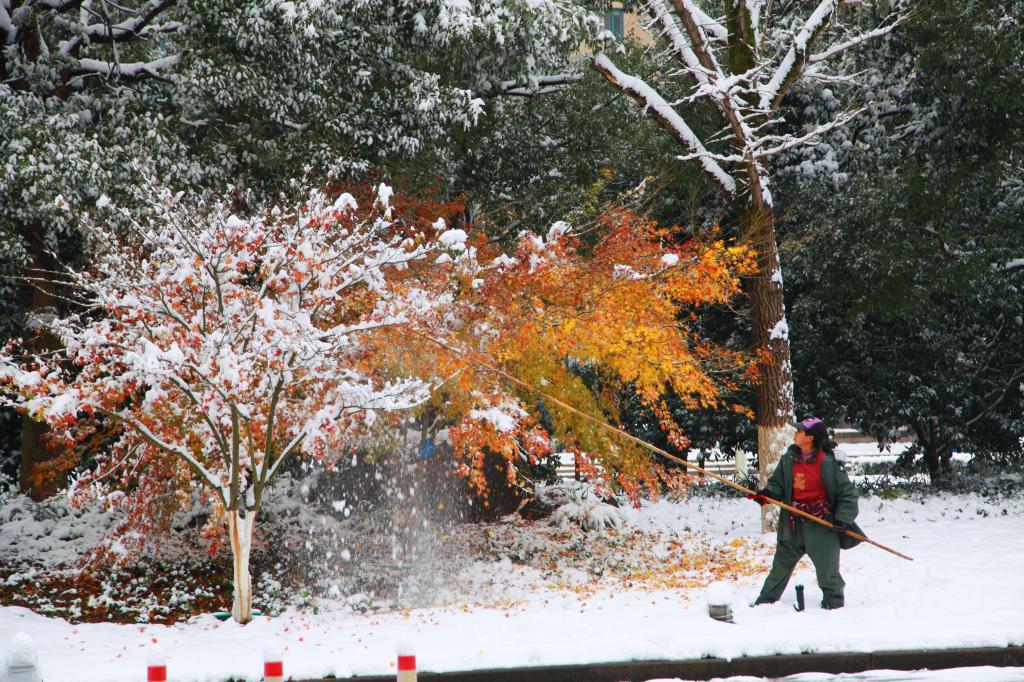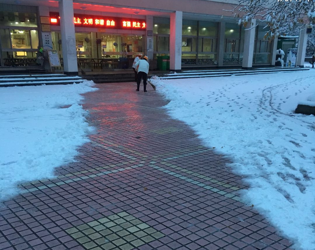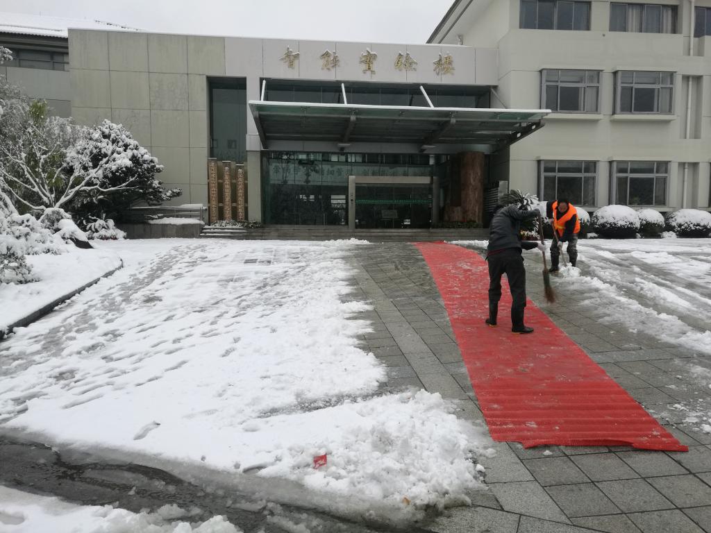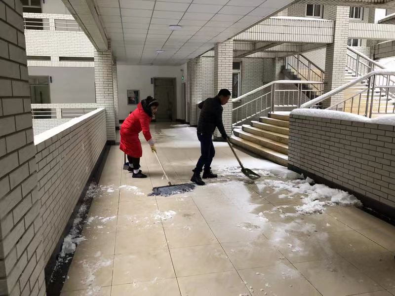 各个学院分别组织力量对学院周边道路及绿化进行了积雪清理;校园保洁组针对行政楼、碳汇楼、智能实验楼等行人出入频繁区域进行重点清扫;绿化养护组对常绿植物、竹子等进行打雪、修枝减负作业;学生公寓、教学楼、食堂等工作人员负责各自工作区域清雪工作。