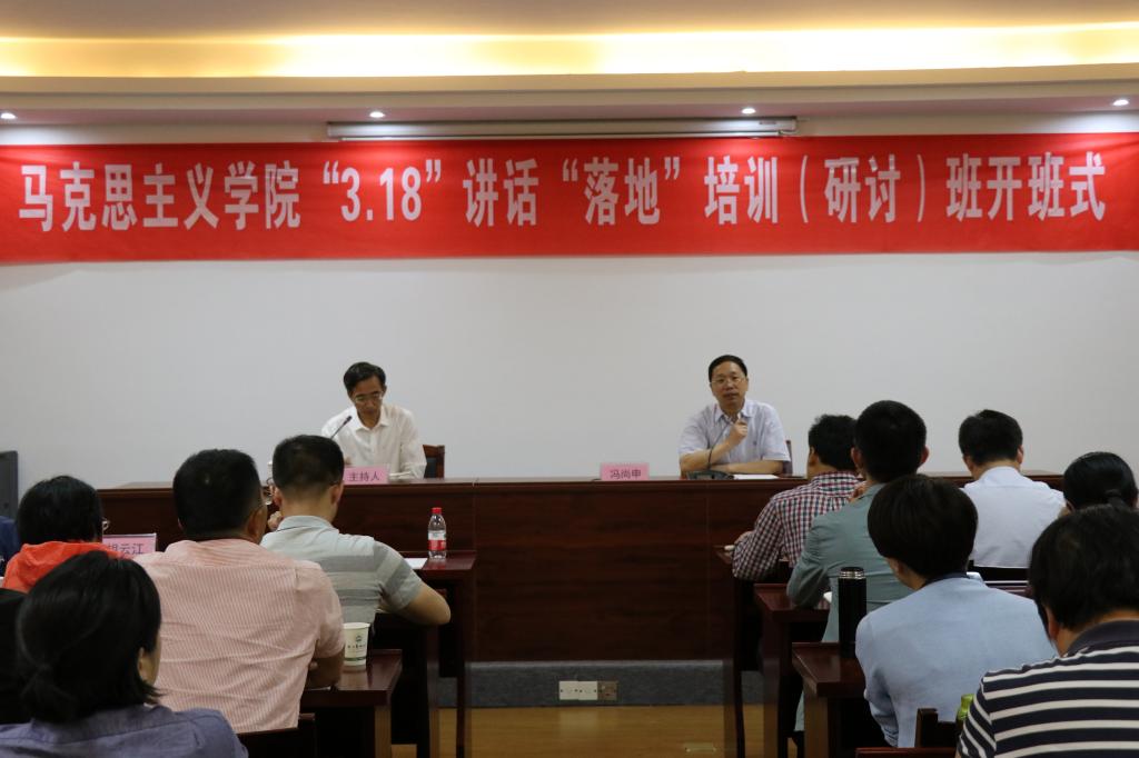 为贯彻落实习近平总书记在学校思想政治理论课教师座谈会上的讲话精神,6月13日,马克思主义学院举办了“3.18”讲话“落地”培训(研讨)班开班式。校党委副书记冯尚申应邀出席并讲话,学院领导及专兼职思政课教师60余人参加。
