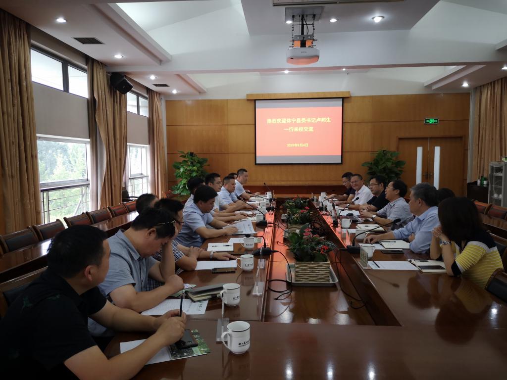 冯尚申对休宁县委书记卢邦生一行来校调研交流表示欢迎,他介绍了学校的发展历史、学科建设、人才队伍建设、科学研究、社会服务等方面的情况。冯尚申表示,近年来,学校为基层发展输送了大批人才,在乡村振兴和精准扶贫中作出了大量的工作,为贵州、安徽、四川等省的贫困山区脱贫攻坚作出努力。
