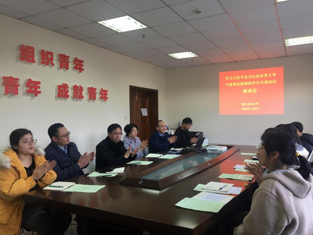 1月8日下午,beat365官网校团委召开座谈会,进一步深入学习习近平给世界大学气候变化联盟学生代表回信精神。森林经理学学科专业负责人杜华强,农业资源与环境学科教师蔡延江,森林经理学科教师徐林,环境与资源学院辅导员侯蕊,竹资源与高效利用博士生李雪建和硕士生、本科生代表10余名师生参加了此次座谈会。