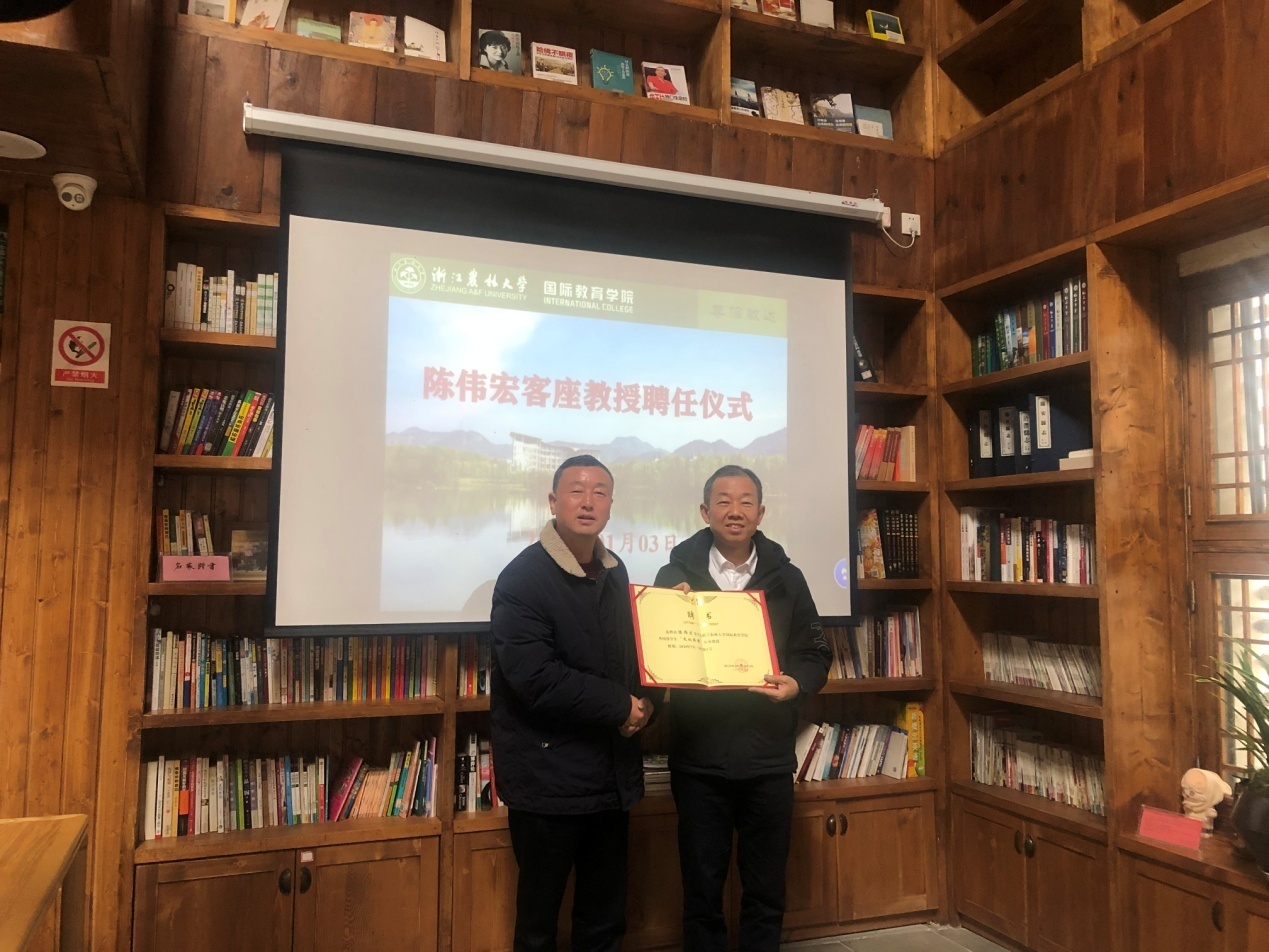 会上,国际教育学院举办了授聘仪式,聘任陈伟宏副局长为beat365官网外国留学生“文化旅游”客座教授。吴家胜为陈伟宏颁发了聘书。他表示,陈伟宏近几年来为临安区村落景区运营作出了较大贡献,所推进的村落景区运营“临安模式”受到了省委省政府领导的批示肯定。这次聘请陈伟宏先生为学校外国留学生“文化旅游”客座教授,将为进一步加强区校合作创造更多的机会。陈伟宏感谢beat365平台唯一官网国际教育学院的信任,并表示一定会进一步深入与学校的对接,共同为区校战略合作添砖加瓦。