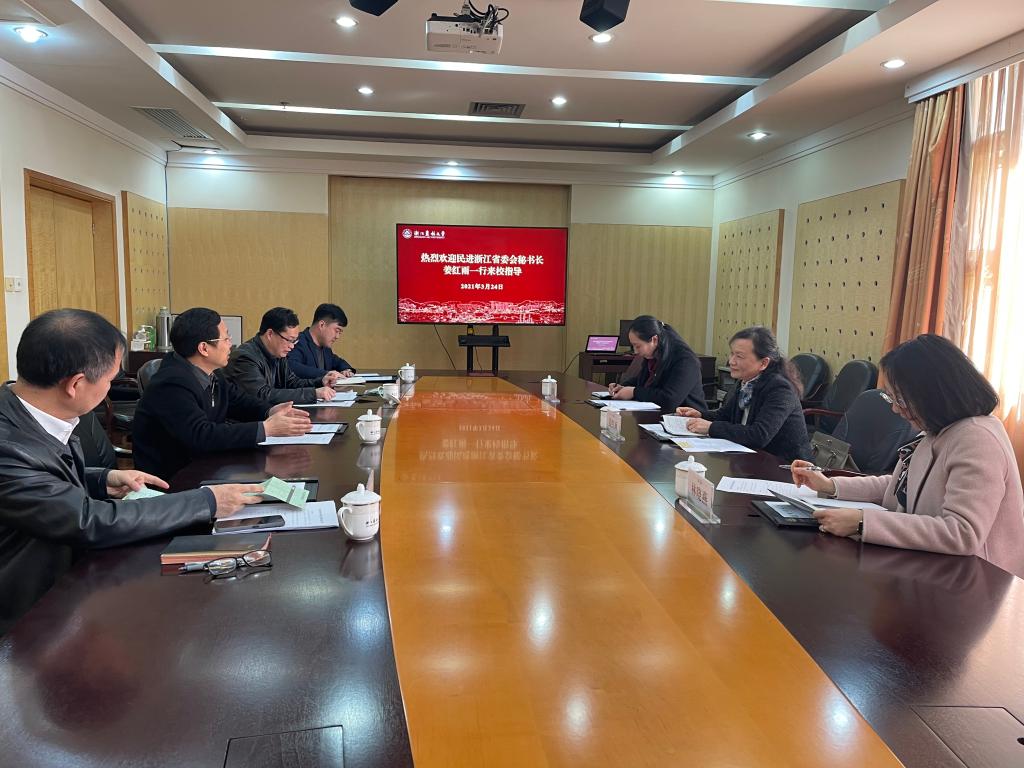 冯尚申对姜红雨一行来校指导工作表示欢迎,并重点介绍了学校的发展情况,对民进浙江省委会一直关心和支持beat365官网发展表示衷心感谢。他指出,学校党委历来高度重视统一战线工作,各民主党派、统战团体在学校教学、科研、管理、服务等方面发挥了重要作用。他表示,学校党委将全力支持民进支部换届工作,也希望支部在民进浙江省委会的关心和指导下,进一步发挥党派优势,立足岗位做贡献,推动学校中心工作。