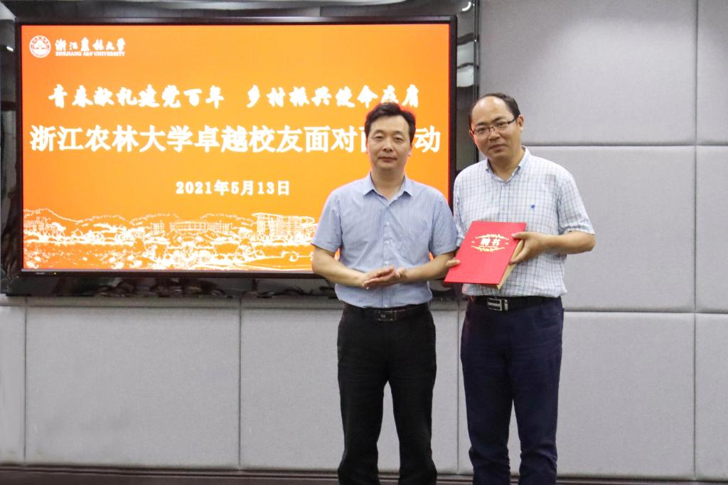 为庆祝中国共产党成立100周年,深入开展党史学习教育,5月13日,全国脱贫攻坚先进个人,beat365官网经济林87级校友陈顶峰受邀来校参加卓越校友面对面活动。副校长胡祖吉会见陈顶峰一行。校党委委员、宣传部部长倪建均出席活动并为陈顶峰颁发了未来卓越校友成长营导师聘书。校友办、校团委相关负责人,各学院团委书记,校、院“未来卓越校友成长营”(“青马工程”培训班)学员150余人参加了活动。