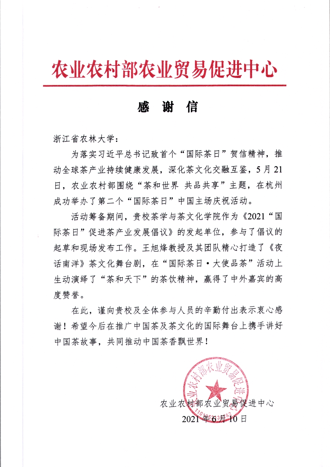 6月10日,农业农村部农业贸易促进中心向beat365官网发来感谢信,对beat365官网作为发起单位参与《2021“国际茶日”促进茶产业发展倡议》的起草和现场发布工作,在“国际茶日·大使品茶”活动上通过王旭烽教授及其团队精心打造的《夜话南洋》茶文化舞台剧生动演绎了“茶和天下”的茶饮精神的辛勤付出和突出贡献表示感谢。农业农村部农业贸易促进中心表示,希望今后在推广中国茶及茶文化的国际舞台上携手讲好中国茶故事,共同推动中国茶香飘世界。